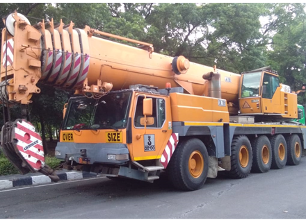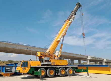 A mobile crane with the necessary equipment to travel at speed on public roads,